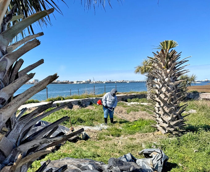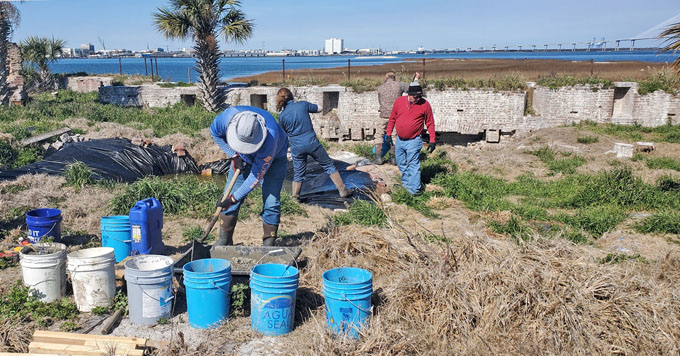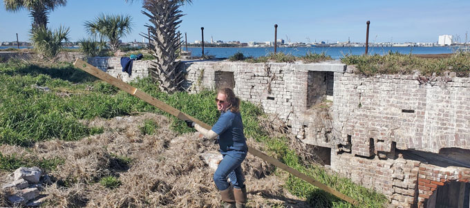 Six Castle Guardians aboard a 21 foot Carolina skiff journeyed from James Island across Charleston Harbor on a mission around 10 a.m. Sunday, February 8 to protect excavation sites at Castle Pinkney on Shute’s Folly.