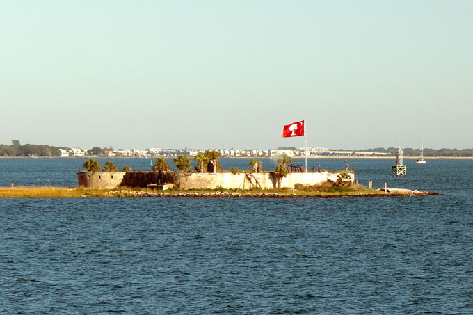 Captain Richard Spellman, at the helm of his Munson landing craft, and crewmembers Miles Marschink and Brian Swan transported the cadets on the short voyage down the Ashley River to perform the flag raising ceremony at Castle Pinckney on Shute’s Folly, a small island in Charleston Harbor. The brick-and-mortar fort was constructed c. 1809 to defend the City of Charleston against the British prior to the War of 1812.